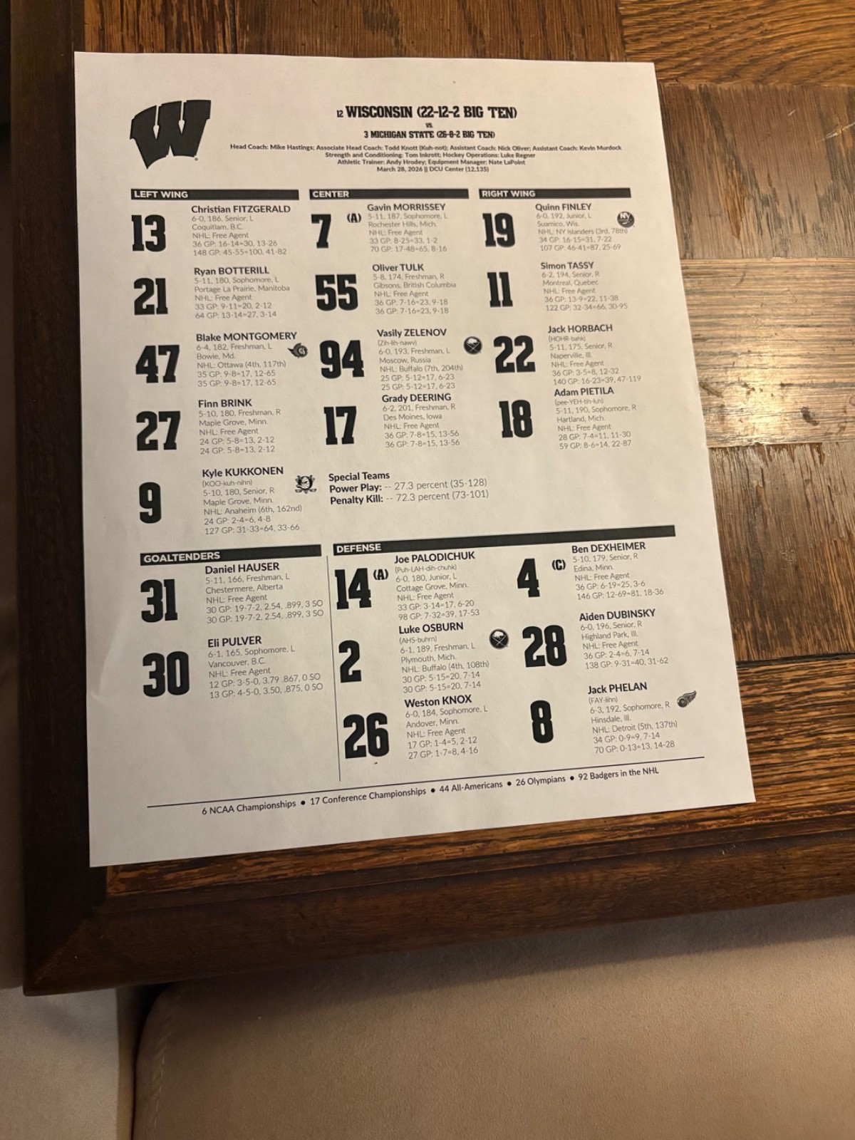 Wisconsin Men’s Ice Hockey Roster Sheet vs. Michigan State: NCAA Regionals: