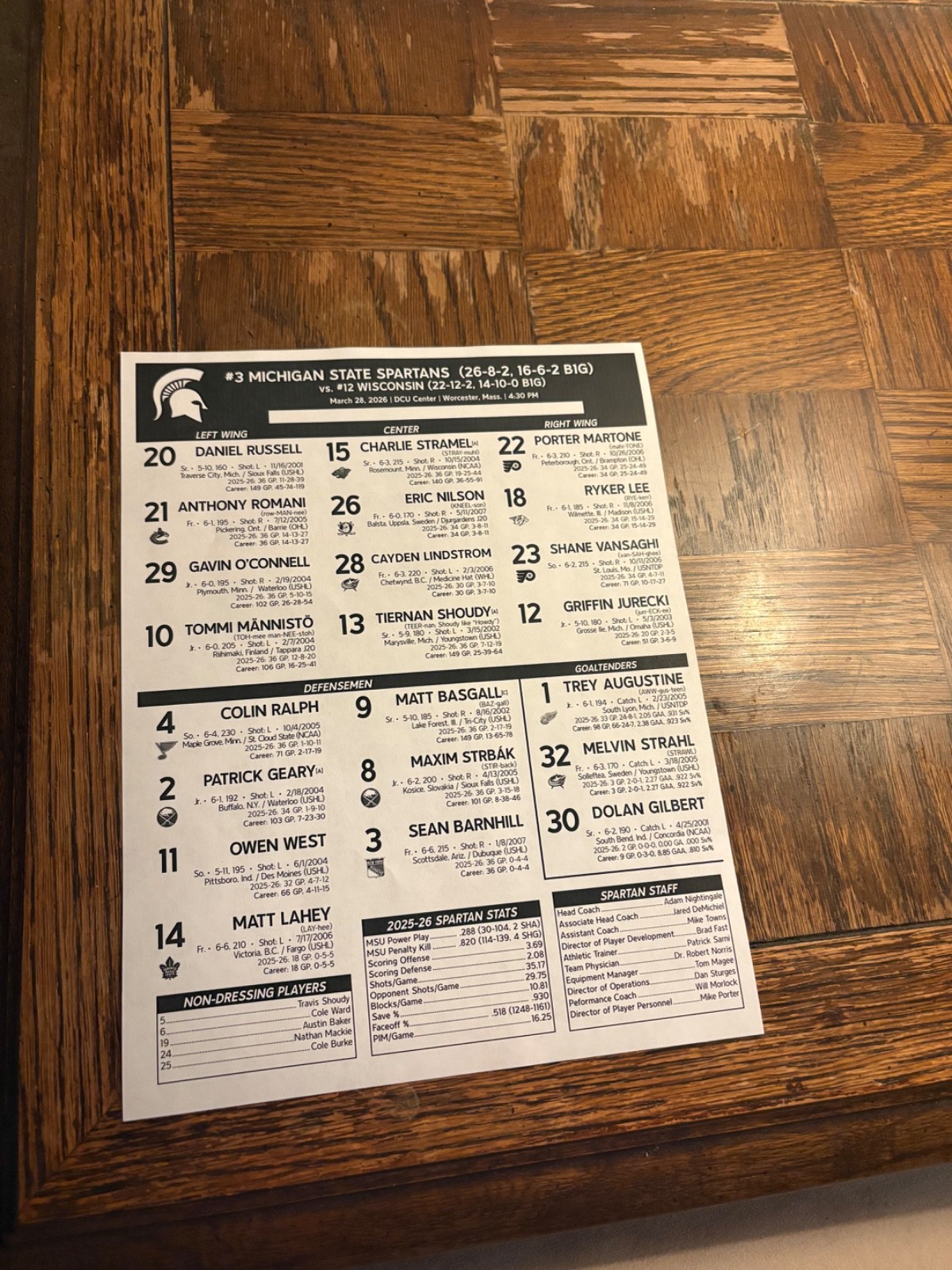Michigan State Men’s Ice Hockey Roster Sheet vs. UConn: NCAA Regionals: 3/26/26