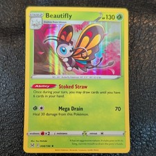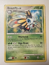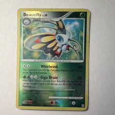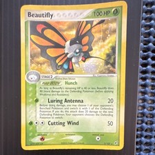 | Ability : Hunch As long as Beautiflys remaining HP is 40 or less Beautifly does 40 more damage to the Defending pokemon (before applying Weakness and Resistance). Luring Antenna : 20 Before doing damage you may choose 1 of your opponents Benched pokemon and switch it with 1 of the Defending pokemon. If you do this attack does 20 damage to the new Defending pokemon. Your opponent chooses the Defending pokemon to switch. Cutting Wind : 50 | |||||