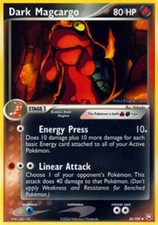| Ability : Hot Plate As long as Dark Magcargo is your Active pokemon whenever a player puts a Baby pokemon or Basic pokemon onto his or her Bench from his or her hand this power does 10 damage to that pokemon. (Dont apply Weakness and Resistance.) This power stops working if Dark Magcargo is Asleep Confused or Paralyzed. Ball of Flame : 20 You may discard a Energy card attached to Dark Magcargo when you use this attack. If you do and if your opponent has any Benched pokemon choose 1 of them and this attack does 20 damage to it. (Dont apply Weakness and Resistance for Benched pokemon.) | |||||
