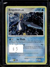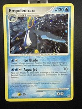 | Ability: Emperor Aura Once during your turn (before your attack) when you play Empoleon from your hand to evolve 1 of your Active pokemon you may use this power. Your opponent can't attach any Energy cards from his or her hand to his or her pokemon during your opponents next turn. Steel Wing : 40 During your opponents next turn any damage done to Empoleon by attacks is reduced by 20 (after applying Weakness and Resistance). Whirlpool : 60 Flip a coin. If heads discard an Energy card attached to the Defending pokemon. | |||||