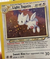 | Ability : Gift When you play Light Togetic from your hand your opponent may search his or her deck for a pokemon Tool card show that card to you and put it into his or her hand. Either way you may do the same and then each player who searched shuffles his or her deck. Sweet Kiss : 30 Your opponent may draw a card. | |||||