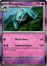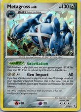 | Ability : Super Connectivity Once during your turn (before you attack) you may search your discard pile for a or Energy card and attach it to your Active pokemon. Then put 1 damage counter on that pokemon. This power cant be used if Metagross is affected by a Special Condition. Link Blast : 70 If Metagross and the Defending pokemon have a different amount of Energy attached to them this attacks base damage is 40 instead of 70. | |||||