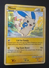| Ability : Chain of Events As long as Minun is your Active pokemon whenever your other Active pokemon if any attacks you may use Cheer On after the first attack (you still need the necessary Energy to use Cheer On). You cant use Cheer On more than once in this way even if your other Active pokemon has the Chain of Events Ability. Cheer On : Remove 1 damage counter from each of your pokemon (including Minun). Special Circuit : Choose 1 of your opponents pokemon. This attack does 20 damage to that pokemon. If you chose pokemon that has a Ability or Ability this attack does 40 damage instead. (Dont apply Weakness and Resistance for Benched pokemon.) | |||||