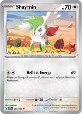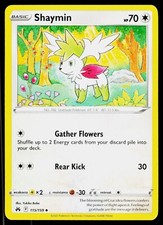 | Ability : Celebration Wind Once during your turn when you put Shaymin from you hand onto your Bench you may move as many Energy cards attached to your pokemon as you like to any of your other pokemon. Energy Bloom : 30 Remove 3 damage counters from each of your pokemon that has any Energy attached to it. | |||||