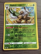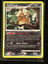 | Ability: Evolutionary Fan Once during your turn when you play Shiftry from your hand to evolve 1 of your pokemon you may choose 1 of your Evolved pokemon in play (excluding any Shiftry). Return that pokemon and all cards attached to it to your hand. Reactive Beating : 30 If Shiftry has any React Energy cards attached to it the Defending pokemon is now Confused. Cross-Cut : 40+ If the Defending pokemon is an Evolved pokemon this attack does 40 damage plus 30 more damage. | |||||